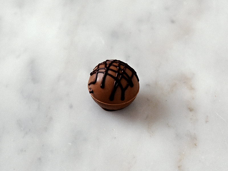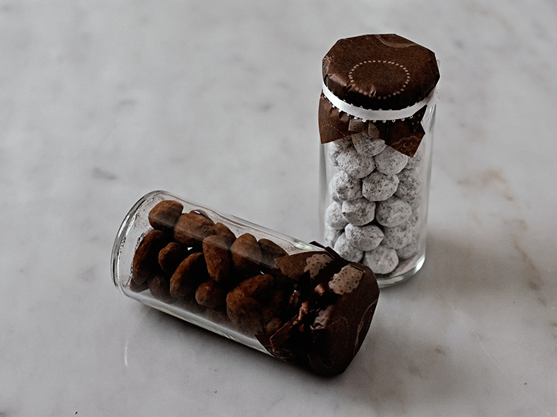 キャラメルでコーティングしたヘーゼルナッツをスィートチョコレートでコーティング、仕上げは粉糖をまぶして。