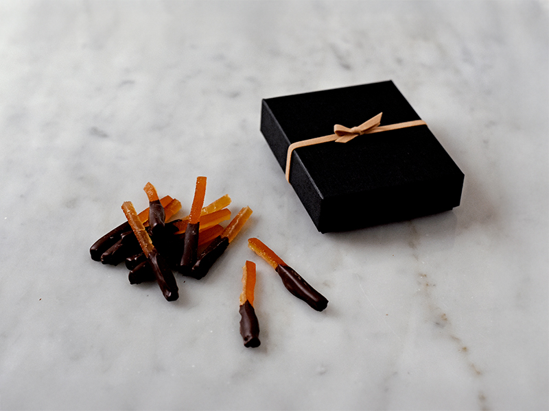 棒状のオレンジの皮をスィートチョコレートでコーティング