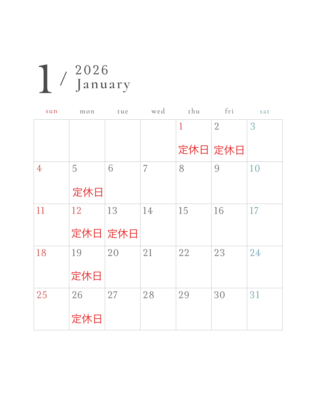 1月の定休日のお知らせです。 1日(木曜日) 2日(金曜日) 5日(月曜日) 12日(月曜日) 13日(火曜日) 19日(月曜日) 26日(月曜日)になります。 御来店お待ちしております。