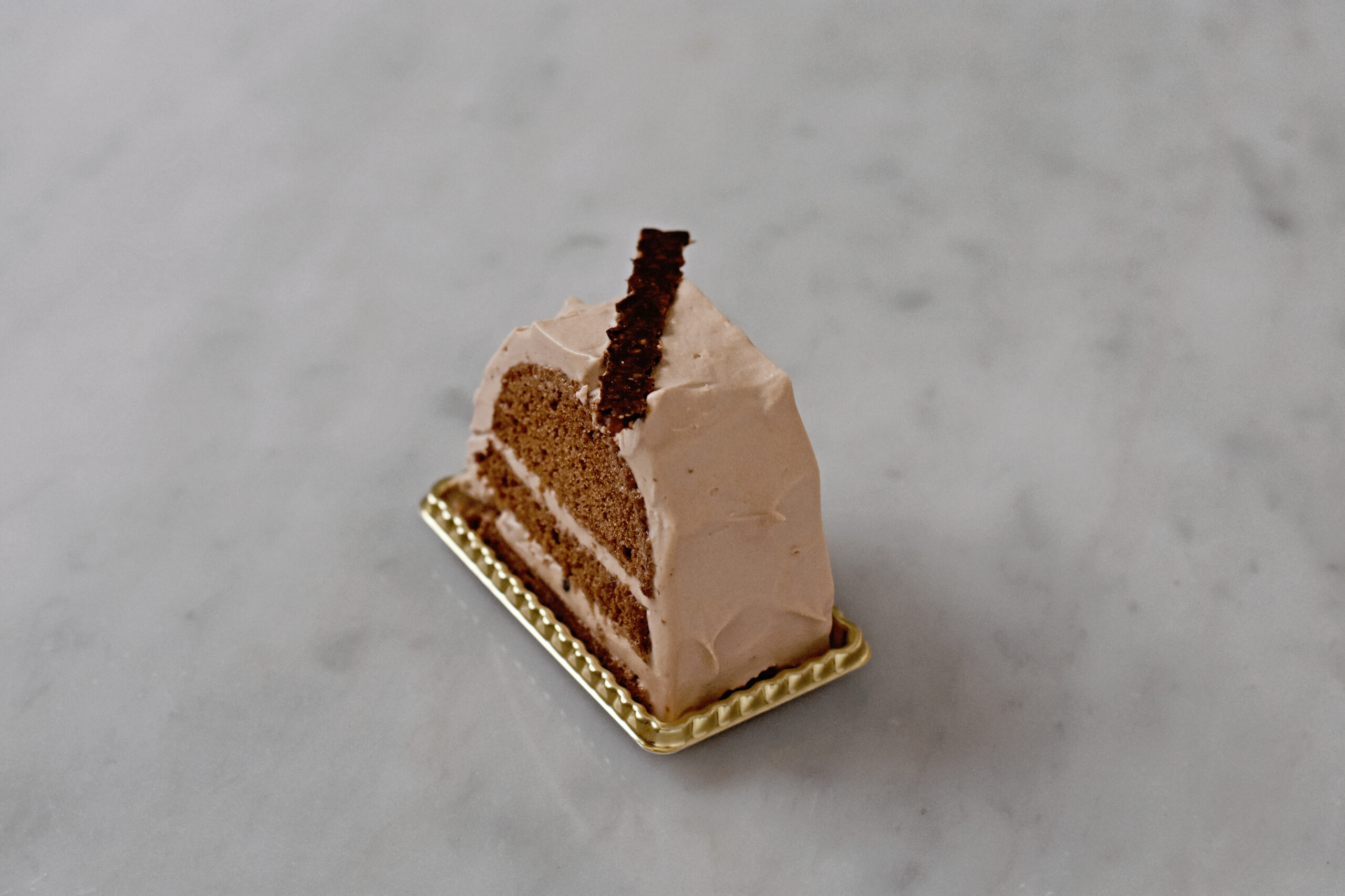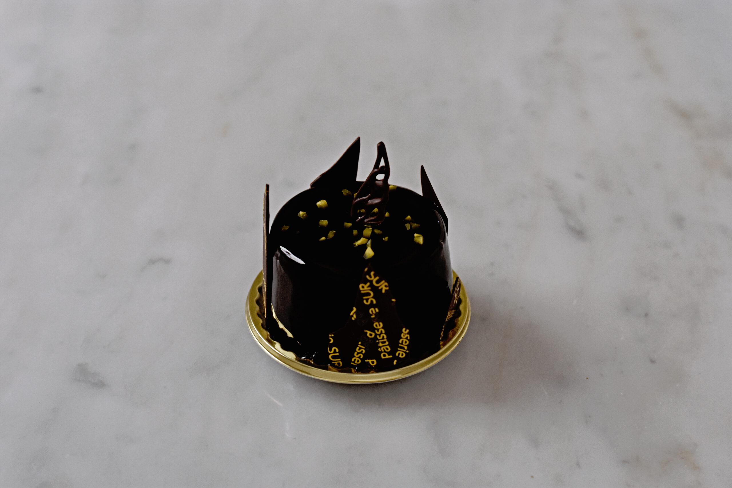 2種類のチョコレートムースにピスタチオのババロワを合わせ、フランボワーズジュレを忍ばせました。