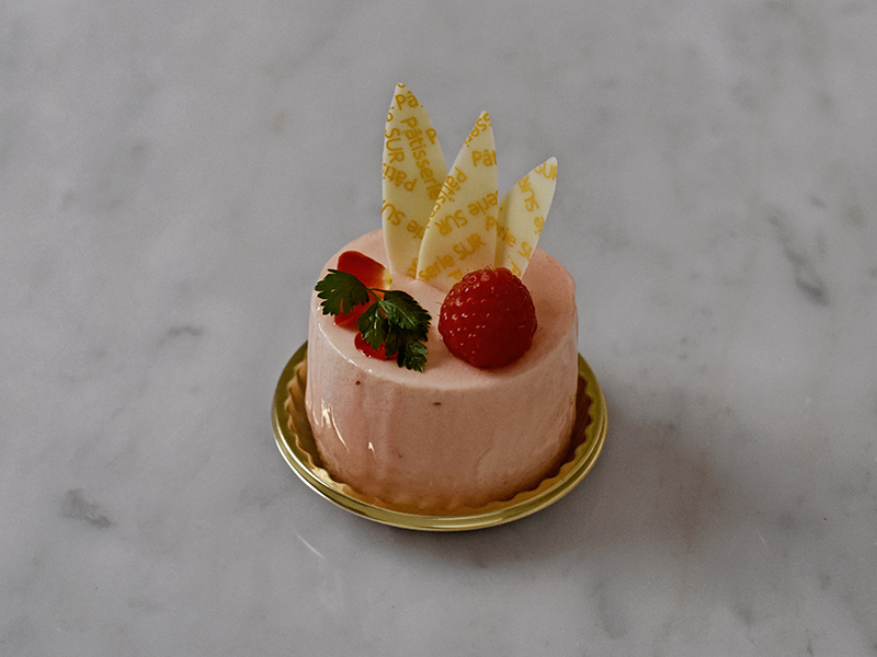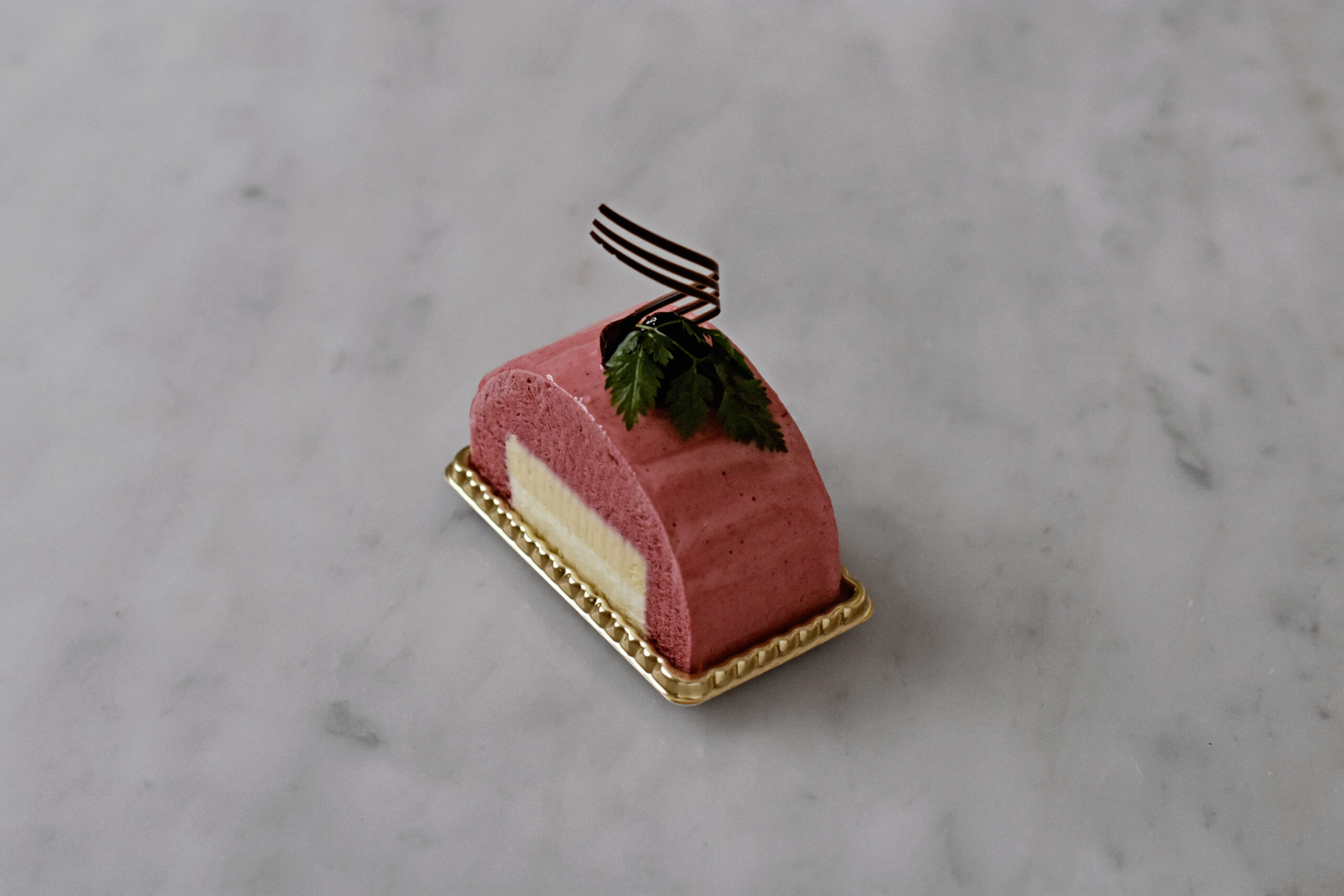 バラ風味のホワイトチョコレートムースの中にバラ風味のババロワとフランボワーズムースを忍ばせました。